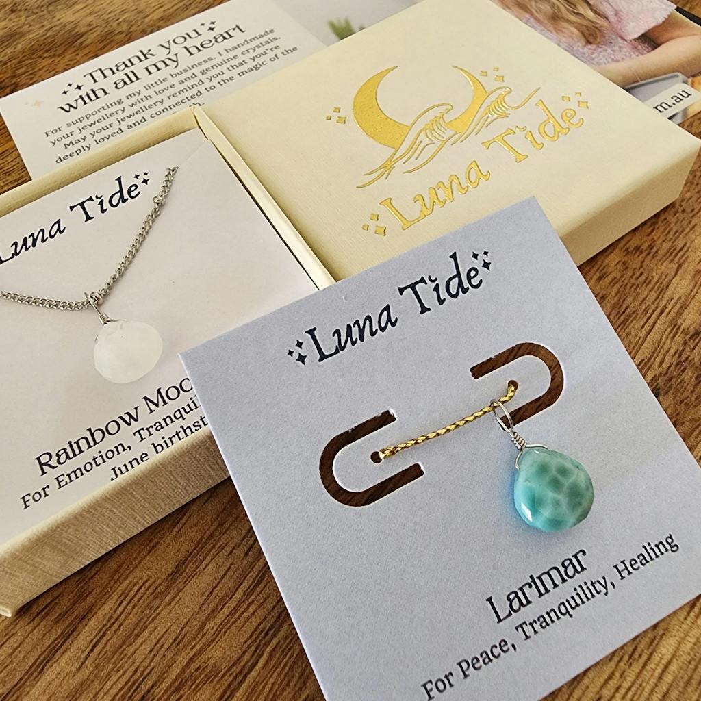Your jewelry is individually presented in a white branded gift box along with a fact card about the crystal. To protect your jewelry we seal the jewelry box in a biogradable bag and send it in a padded envelope.